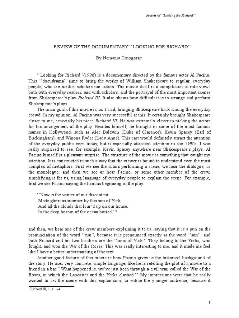 Read, review and discuss the entire looking for richard movie script by william shakespeare on scripts.com. It is both a performance of selected scenes of william shakespeare's richard iii and a broader examination of shakespeare's continuing role and relevance in popular culture. It is a documentary that explores shaky's bloody.